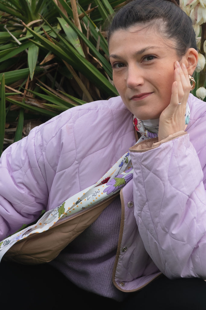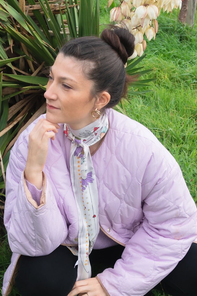 Les foulards en polyester sont fabriqués à partir d'un fil de polyester recyclé. Il est ensuite tissé à la façon "twill" pour lui donner cet aspect chic qu'on adore ! Les foulards sont imprimés et fabriqués en France 🇫🇷
