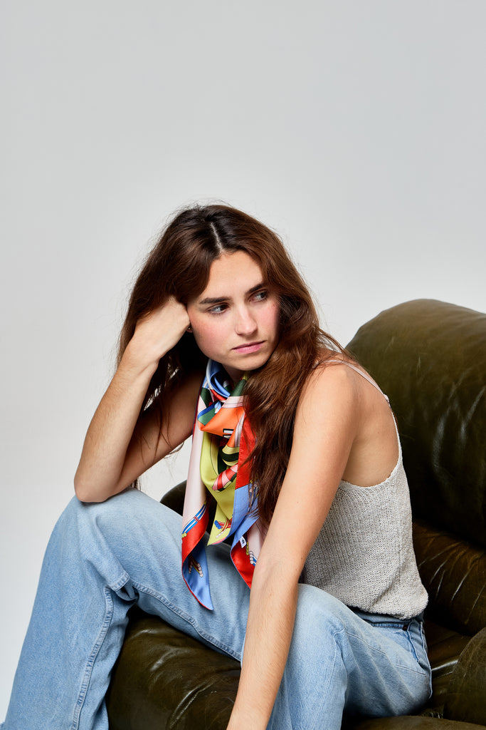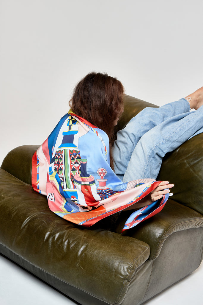 Les foulards en polyester sont fabriqués à partir d'un fil de polyester recyclé. Il est ensuite tissé à la façon "twill" pour lui donner cet aspect chic qu'on adore ! Les foulards sont imprimés et fabriqués en France 🇫🇷