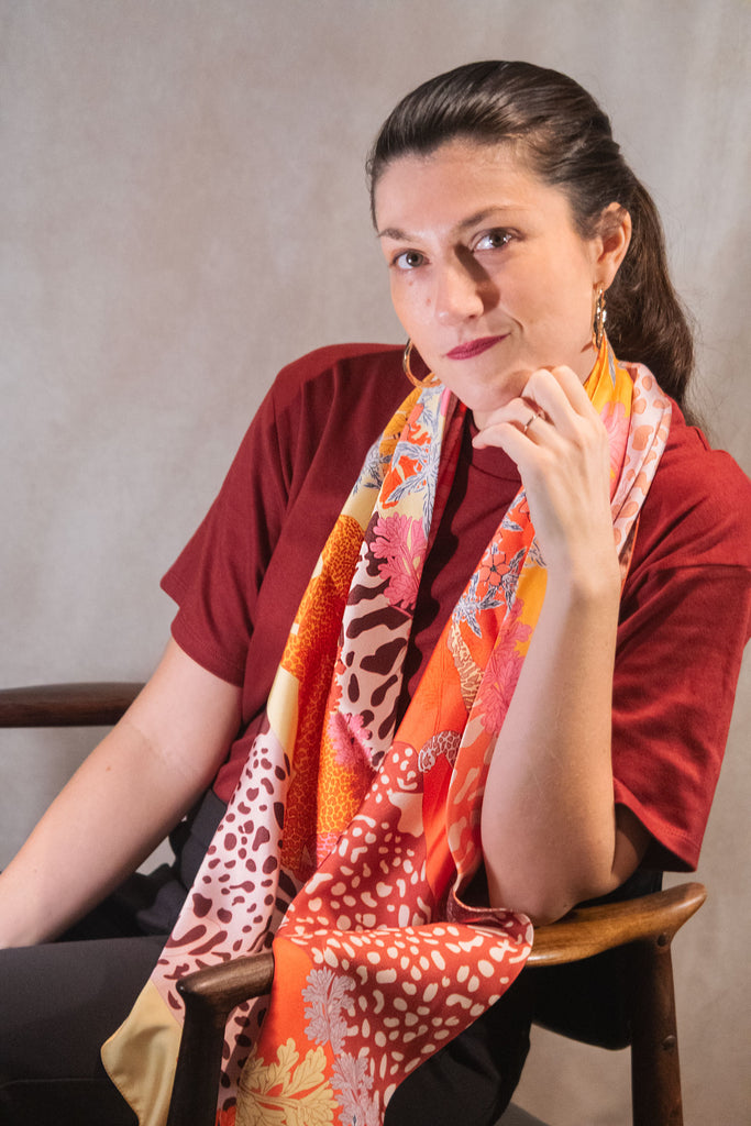 Nous créons différents formats de foulards en polyester recyclé : foulards triangles, foulards rubans, foulards bandeaux à porter en ceinture ou dans les cheveux, et nos petits chouchous.