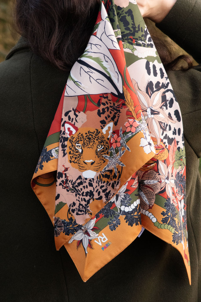 plastique revalorisées, pour la composition de certains de nos foulards et accessoires. Faire le choix de matières recyclées plutôt que des matières traditionnelles permet de réduire entre 40% et 90% leurs émissions de CO₂. Notre tissu twill en polyester est fabriqué à partir d'un fil de polyester recyclé. Il est ensuite tissé à la façon "twill" pour lui donner cet aspect chic qu'on adore ! Les foulards sont imprimés et fabriqués en France par un procédé de sublimation 🇫🇷