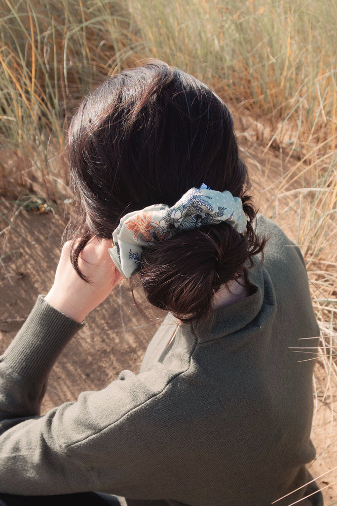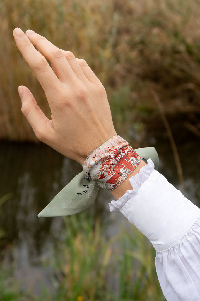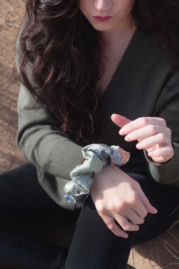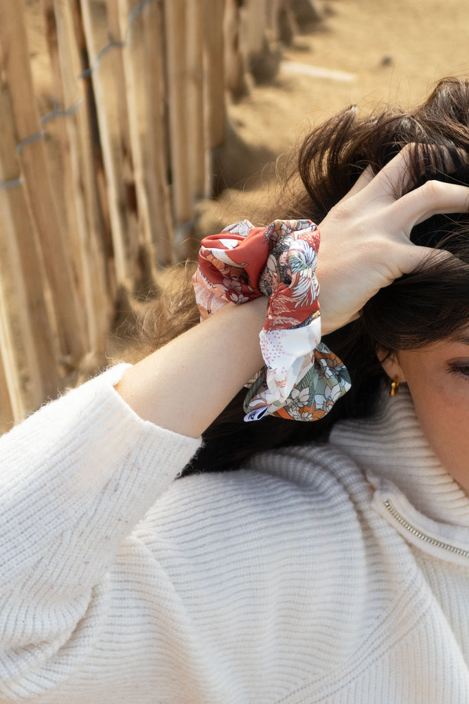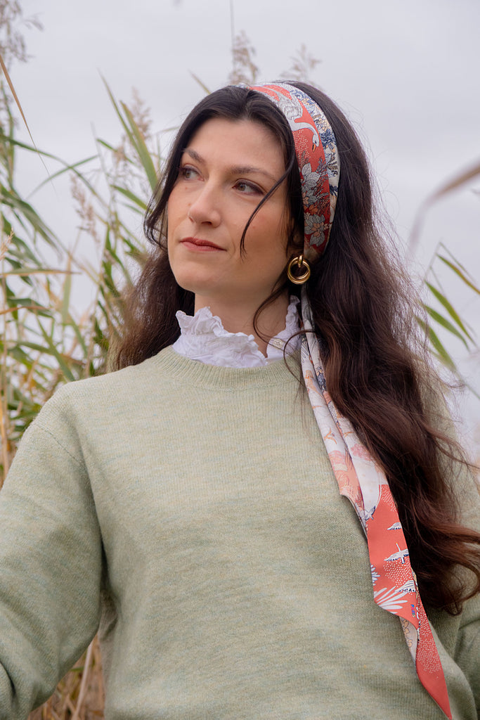 Nous créons différents formats de foulards en polyester recyclé : foulards triangles, foulards rubans, foulards bandeaux à porter en ceinture ou dans les cheveux, et nos petits chouchous.
