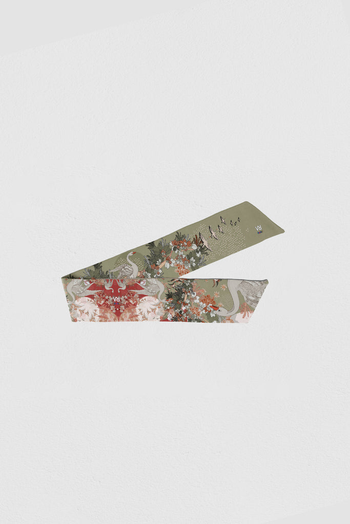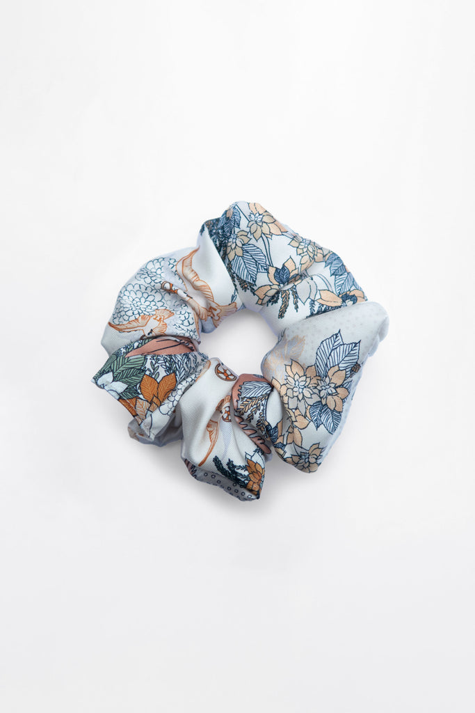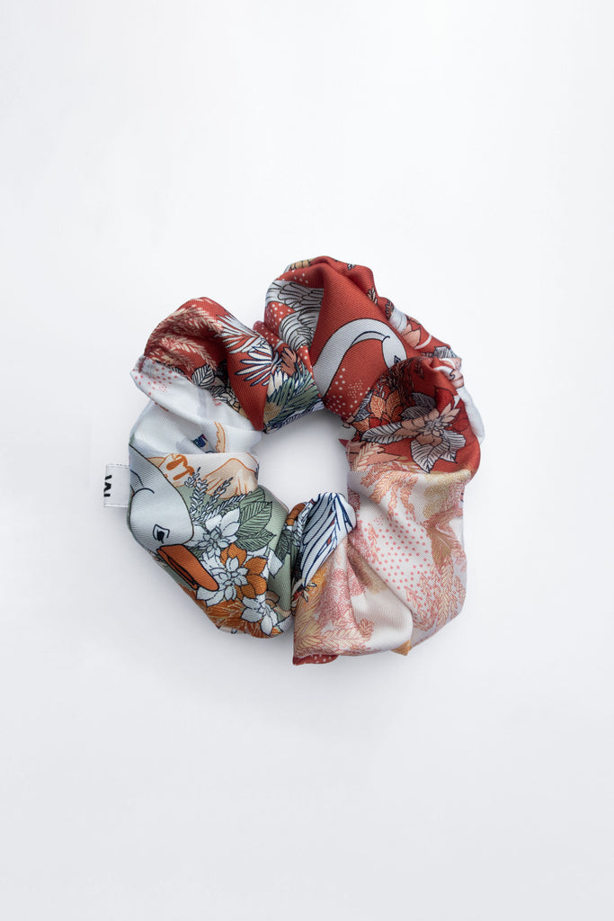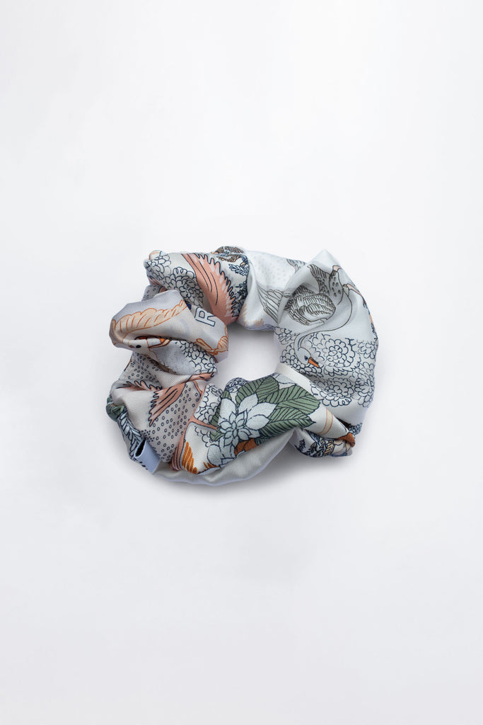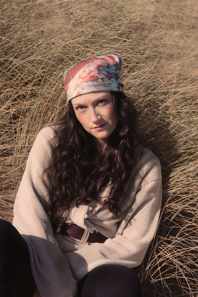 Nous créons différents formats de foulards en polyester recyclé : foulards triangles, foulards rubans, foulards bandeaux à porter en ceinture ou dans les cheveux, et nos petits chouchous.