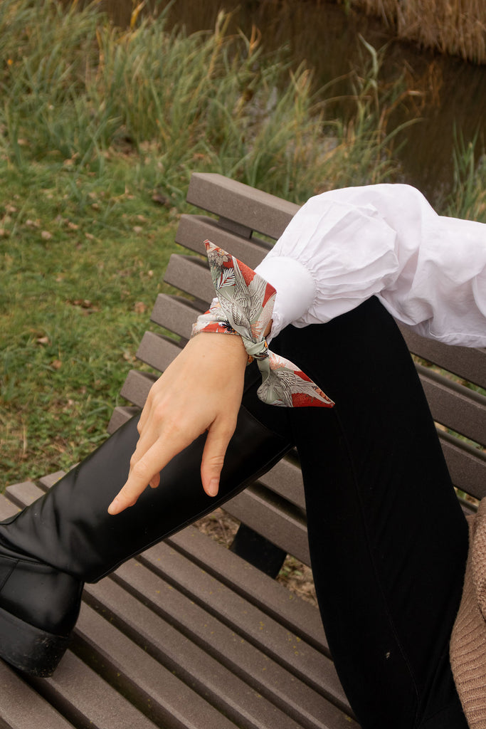 Les foulards en polyester sont fabriqués à partir d'un fil de polyester recyclé. Il est ensuite tissé à la façon "twill" pour lui donner cet aspect chic qu'on adore ! Les foulards sont imprimés et fabriqués en France 🇫🇷